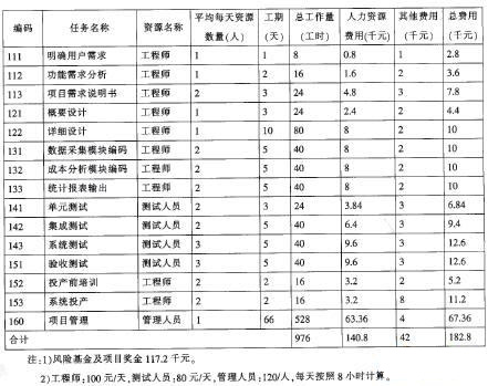 表3 成本软件管理项目进度、人力资源和费用一览表