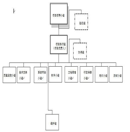 该小组也可根据项目的实际情况分成几个小组,分别负责应用软件、系统网络、文档管理、项目支持、质量监控、行政保障工作。