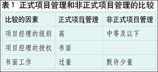也是从这个时候起,非正式的管理方式开始走进人们的视线。表1列出了正式项目管理和非正式项目管理的几个不同点。从中可以看到,两者主要的不同点在于书面工作量的差异。方针和程序文档的编写代表了项目管理的正式性,清单则代表了非正式性。