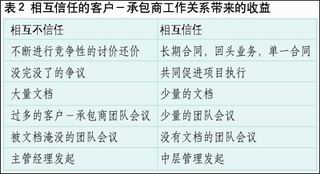 信任在建立承包商/分包商与客户之间的良好关系时同样重要。当客户和承包商之间的关系是建立在信任的基础上时,双方自然都获得了众多好处。表2列出了可以获得的收益。