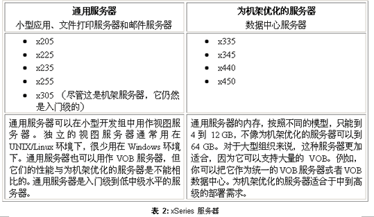IBM提供的xSeries服务器基于Intel平台。本节主要给那些要在Windows 或者 Linux环境下使用ClearCase方案的组织使用。本节描述的服务器都可以作为VOB或者视图服务器。XSeries服务器分为两个类型,如下表所示: