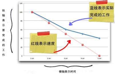 燃尽图(burn down chart)是在项目完成之前,对需要完成的工作的一种可视化表示。燃尽图有一个Y轴(工作)和X轴(时间)。理想情况下,该图表是一个向下的曲线,随着剩余工作的完成,“烧尽”至零。燃尽图向项目组成员和企业主提供工作进展的一个公共视图。这个词常常用于敏捷编程。