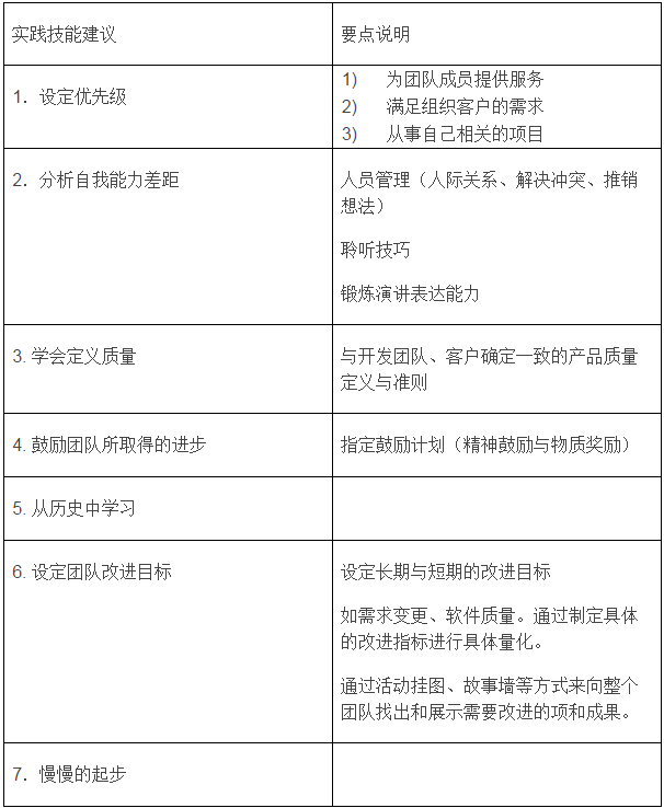 找出自己在项目管理、人员管理和团队领导力中的短板,并想办法进行提高;找到一些经验丰富的项目经理们作为你学习的楷模,并尝试运用它们的优点;从你过去的一些上司、领导处总结哪些行为和特点是你无法忍受的,然后再你自己的管理工作中去规避这些做法。