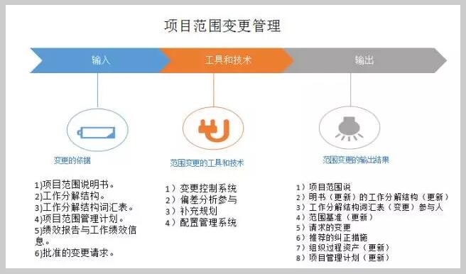 导读:在工程项目的实施过程中,项目合同赋予业主有权在合同范围内对工程进行变更,这是一种惯例。本文通过『输入』『工具和技术』『输出』的形式展示了如何进行范围变更管理。