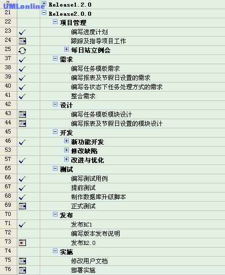 该进度计划按版本来组织任务,而每个版本则按照项目管理、需求、设计、开发、测试、发布、实施来组织任务。