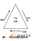 图1所示的是项目范围管理中有名的三角理论,该理论反映的是项目的产品范围和工作范围应该保持平衡.当产品范围(交付物)保持不变的情况下,三角形的三条边资源(成本)、时间(合同工期)、质量(产品功能)相互依赖,相互牵制.比如,当提高质量时,要么增加资源(改变资源基线),要么延长产品的交付时间(改变合同工期).3者的关系如同一个三角形,假如产品范一围是它的面积,质量、资源和时间是它的3条边,当保持面积不变时改变其中的一条边其它两条边不变是不可能的。根据三角理论提示,需要注意,在项目开发中,不仅要清楚需要做的功能,而且要避免开发无用的功能.因为当有限的时间和资源造成浪费时,有用功能的质量势必会受到影响.