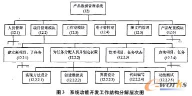 工作单元划分完毕后,为了便于信息传递、综合管理与控制,需要为这些单元编上号码,为项目建立合适的编码系统很重要,这样在单元查找、变更、时间安排和费用安排时,会带来很多便利.编码的方式有多种,本项目采用的是任务序号编码方式.根据经验,工作量细分后在几天至一个星期内完成比较有利,这样不仅使时间估计误差较小,对时间的计划和跟踪、管理也较方便,以下是此次项目的关键部分,产品数据管理系统功能开发的工作结构分解示意图(图3),它在整个项目中工作排序为12号.