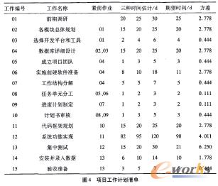 在工作细 分的基础上,由具体执行开发的工作人员根据经验和自身条件,对自己的工作进行时间估计.如果任务复杂的工作小组,可在估计完自身完成时间的基础上,用网络图法优化工作排序,压缩关键路径时间,由此得完成任务时间;如该系统编制的任务(12号任务),经此方法估算得正常完成时间约95d.估算完每个任务的时间后,下一步可以给这些任务排序,并估算出整个项目的时间了.
