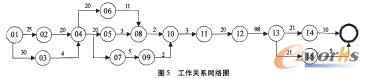 结合以上分析,对该项目的结构分解及时间估计作出项目工作计划清单,如图4所示.然后根据工作清单和工作关系绘制网络图(见图5),图中圆圈代表工作单元编号,箭头方向代表时间顺序,箭头上数值代表估计工期.