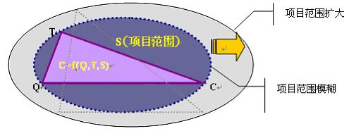 如果项目范围即既定的面积S不变,成本C、质量Q、时间T可以在一个固定的S的边界限制下给出一个约束的关系模型Cost=f(Quality,Time,Scope)。但是,如果S的值并不固定,如图1所示出现边界模糊或者向外扩展时, C、Q、T失去可依赖的边界限制,其之间的约束关系会变得复杂。因此,我们在对项目范围进行控制时,一是要保证项目初期的S是准确可靠的,尽量减少边界的模糊性;二是要保证项目实施过程中S的稳定,尽量避免扩大化,或是说让扩大化受到合理的控制。