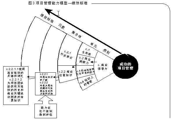 成功的项目管理所需的三大技能被分解为不同的单元,每一个单元又被分解为技能的集合体。这些集合体再次细分为不同的元素,终,元素被分解得到绩效标准。