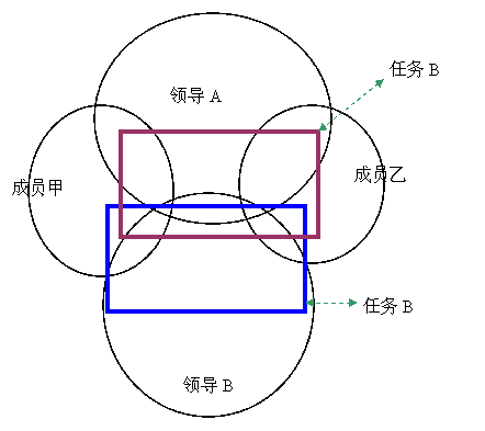 其中蓝色的方框代表一个部门(执行某种职能的架构),暗红色方框代表另外一个部门,这二个部门之间会有一些交接和协作,如开发部门和测试部门。图中的黑色圆圈代表团队成员的责任范围,上图中有下面几层含义: