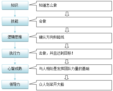 这个模型是还是一个层次分明的、渐进的模型。从知识到执行力,实际上是一个从“知道”到“去做”的过程,而从心智成熟到领导力,是发挥团队力量的两个阶段。