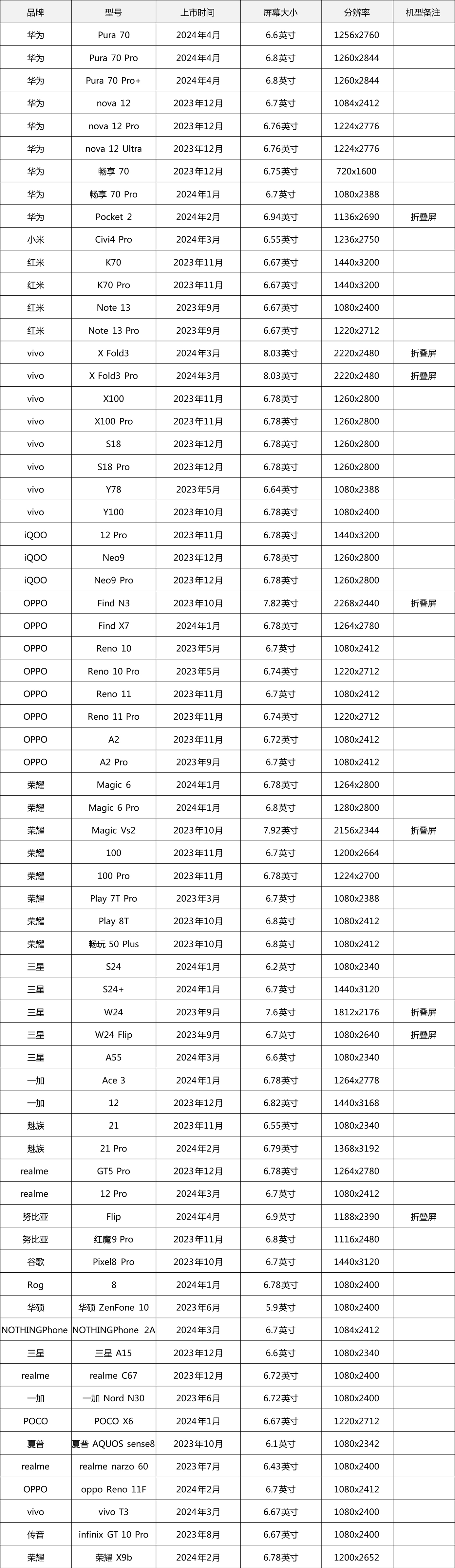 泽众云真机平台机型,2024年4月份即将升级,按目前工作进度,月底之前升级完成。这次升级机型包括2024年刚上市机型,如华为Pura 70系列、nova 12系列、Reno 11系列等等,高端折叠屏机型。还有一部分,来自平台运维日常用户咨询缺少的机型,响应用户需求机型补全。