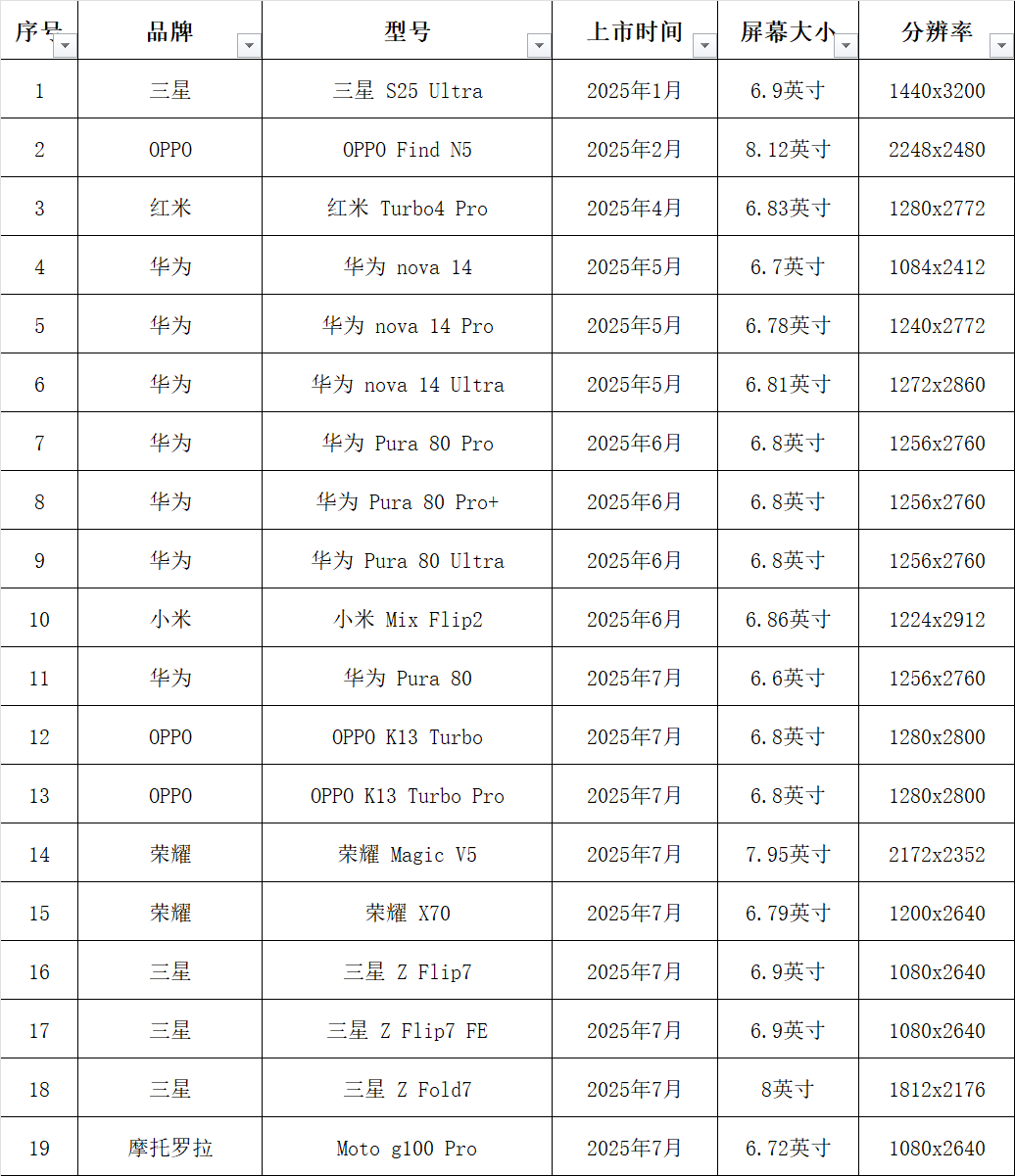 计划2025年8月平台再次升级新机型,主要包括1月到7月新上市机型,本次机型升级也是今年第二轮升级(少量升级不记次数),具体机型列表如下: