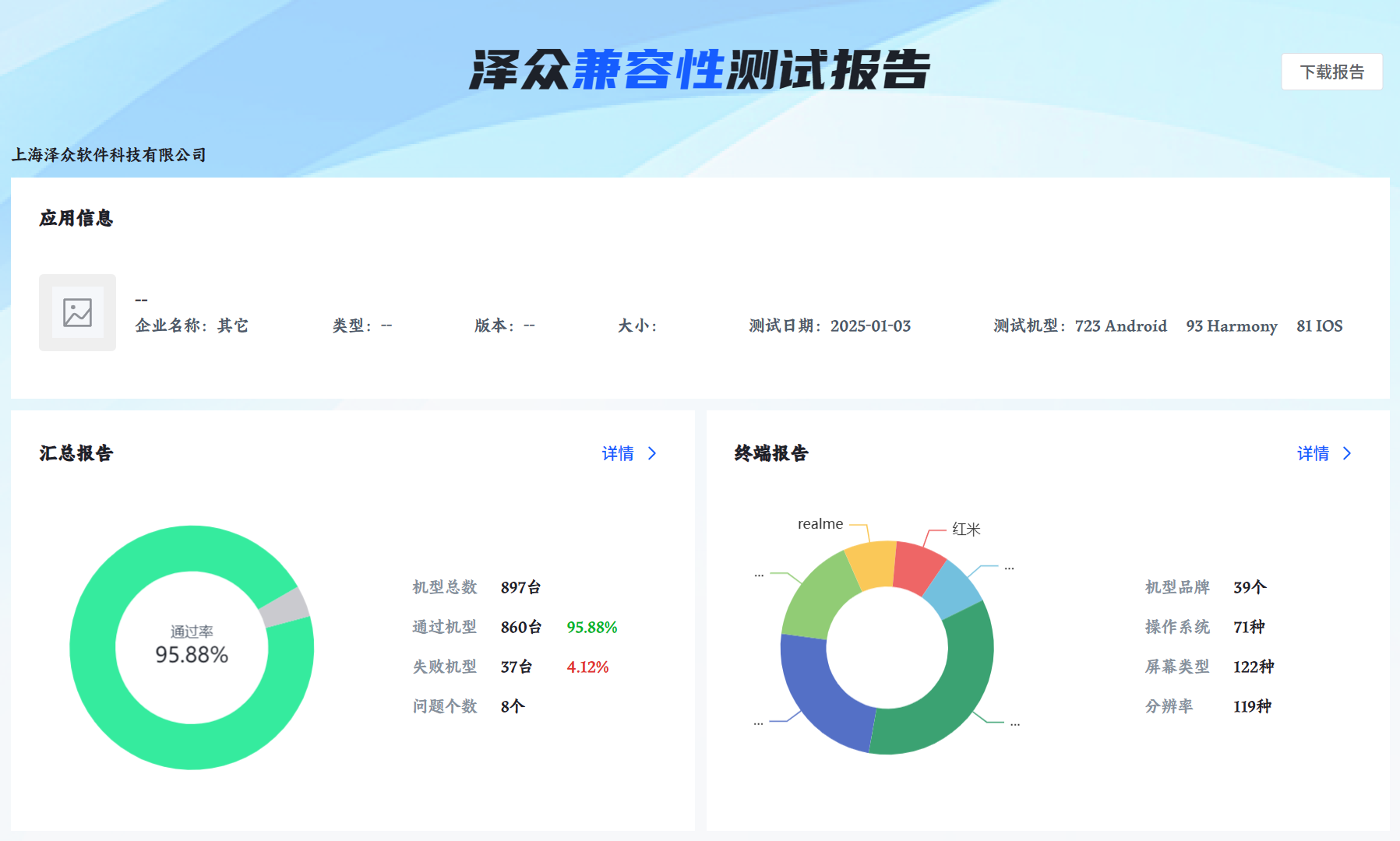 泽众云真机平台的核心业务深度兼容性测试服务一直备受市场认可。采用自动化测试与特殊场景测试(人工)相结合的方式,经过人工复核结果后生成缺陷列表,并自动生成测试报告。针对缺陷机型,平台还提供免费回归测试服务,并在回归测试时提供泽众云真机平台,协助客户远程调试定位兼容性问题。此外,用户也可以在平台上进行自助兼容性测试,自主解决应用的兼容性问题。