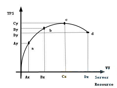 以上模型图为准则,在a点与b点之间的系统性能,表示以性能目标预期为前提,对系统进行施压,验证系统在资源可用范围内,是否能达到性能预期的目标。