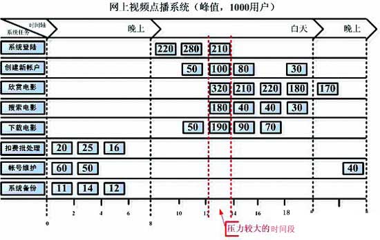 有了上面的基础知识,下面开始逐一讨论各类测试用例设计的细节。在下面的讨论中,将以图2所示的某视频点播网站做为示例,图2显示了该视频点播网站的主要业务以及各个时间段使用场景。