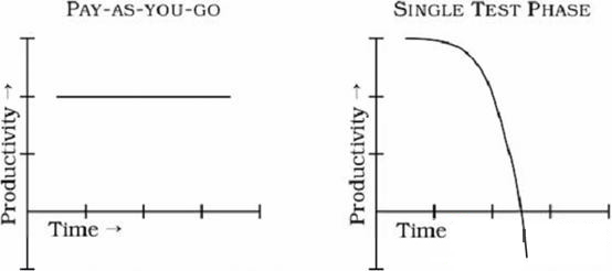 从图 1.1 中你可以看到,“立即测试”和“延后测试”之间并没有权衡可言;而是直线效率和指数效率之间的对比,而且对于后者而言,复杂度会不断增加,并且在项目后期,很多工作需要从头再来。所有这些额外的工作都会影响你的工作效率,如图1.1 所示。