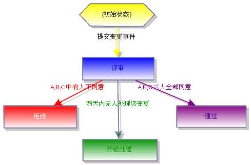 这工作流指明了,在一个变更事件被创建后,它需要经过一个《评审》状态。在评审阶段里,有三个人(A,B和C)要全部同意,才能到达《通过》状态。有任何一人不同意,状态转到《拒绝》。当一到达《评审》状态,系统马上促发邮件和手机通知,将信息寄给A,B和C。系统可以预先设定这三人有两天的时间评审该变更。假如两天过了,状态仍为《评审》,那是有人未及时处理该事件。这时候,系统会自动将事件升级,把状态转换为《升级处理》,系统马上促发邮件,将信息寄给研发部王总监。王总监可以斟酌情况,做妥善的处理。