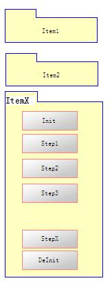 我们的自动测试软件无论是真的硬件性能的测试或者真的软件功能模块稳健性的测试,对我们来说都可以把她抽象成一个个独立功能的Item(Process或者function),在每一项item里又会有其特定的执行过程,我们可以将这个过程抽象出一个个step,当然这些step对我们来说都是表象的step,没必要去考虑每个step具体的运行环境和执行流程,画个图吧:
