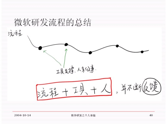 可以这么比喻,微软这套研发模式让其中的每个人都成了一架高速运转的机器上的各种零件,少数零件坏了不要紧,可以随时更换。当然微软有许许多多技术高手,但我认为更重要是其研发模式保证了软件产品的高品质、可持续发展。