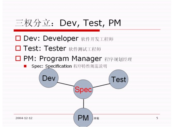 (1)研发人员分工明确。主要的三个角色:PM (Program Manager)、Dev (Developer)、Tester三者分工明确、接口清晰,PM来定义需求、书写出来每个功能特性(Feature)的设计文档(Spec),Dev写代码来实现这个Spec,Tester来测试Dev做出来的东西是否符合PM定义的Spec,三个角色之间并无必然的上下级关系,只是分工合作完成某个功能(Feature)。我将之形容为“三权分立”,三者之间有效合作并制衡。国内企业好像还没有PM这个角色,而测试人员又往往成为开发人员的附庸,一个Bug是否要被解决全由开发人员说了算,这很糟糕,像政治上一个权力没有被有效的制衡一样,一定会产生各种问题。