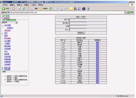 (5)BugFree程序规模很小,一个中等水平的PHP程序员可以在1~2周内看懂所有的代码,然后可以根据自己的需要做相应的定制了;
