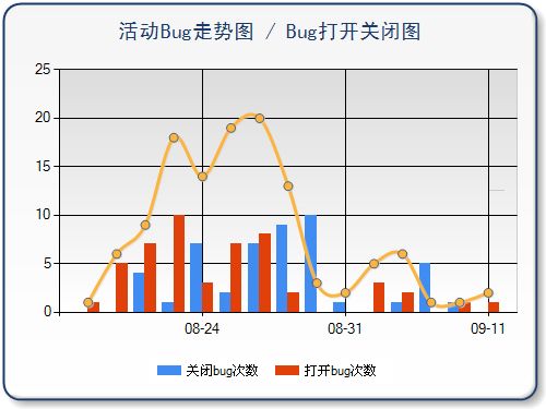 说明了这些概念,上面两个模型比较好理解了。活动bug走势曲线上的每个点,表示当天软件中还存在多少个活动bug。这个数字越大,说明软件的质量越差。而bug打开关闭图中,每天都会有红色、蓝色共两根柱子,表示当天打开、关闭bug的次数,如果当天这两个数字都很高,说明bug的处理非常活跃,软件非常不稳定。注意,活动bug的单位是“个”,而打开关闭的单位是“次”,因此我们用线图和柱图分别表示。