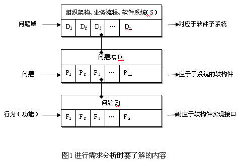 需求分析不象侦探推理那样从蛛丝马迹着手。应该先了解宏观的问题,再了解细节的问题,如图1所示。