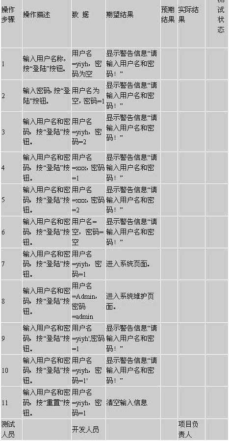 备注:本用例未考虑“企业代码”的输入情况;测试用例并未涵盖所有的非法输入,如非法输入中可能会有 “user=*,pw=*”的组合,对回车的默认操作,空格输入,对输入上溢的处理的处理(可能会跳过身份验证) 等等。