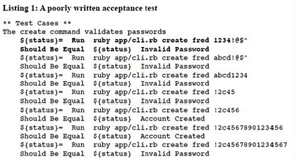 列表 1 展示的是一段不良自动化测试用例脚本,该测试用例用来检测 Create 命令的密码有效性检查这一职责。