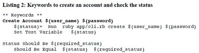 现在还无法运行新的脚本,因为测试框架 Robot 找不到关键字 Create Account 和 Status Should Be 的定义,两个关键字的 Ruby 实现代码如表2。