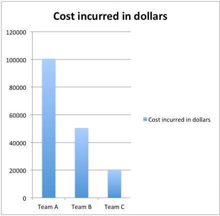 如你所见,对某一发布的候选构建做一次全面测试,团队A的花销(10万美元之多)几乎是团队C的5倍。