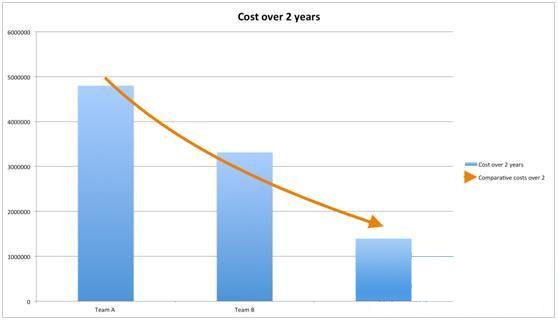 针对这一数字,为了达到每天测试一遍构建这一目标,在2年时间里团队A的成本有四百八十万美元之巨。相比之下,团队C的成本接近一百四十万美元,成本减少了70%。从下面的图表可以更直观地看到这一点: