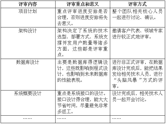 技术评审可以把一些软件缺陷消灭在代码开发之前,尤其是一些架构方面的缺陷。在项目实施中,为了节省时间应该优先对一些重要环节进行技术评审,这些环节主要有:项目计划、软件架构设计、数据库逻辑设计、系统概要设计等。如果时间和资源允许,可以考虑适当增加评审内容。