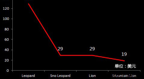 这是我们统计的近苹果四次升级Mac OS X系统时,用户所需要花费的升级费用。当年从较早的Tiger系统升级到Leopard时,用户需要花费129美元,已经是高峰了,而且那还是在2007年。想想那个时候微软的WinXP需要多少钱?即使便宜的家庭简化版,也要199美刀。
