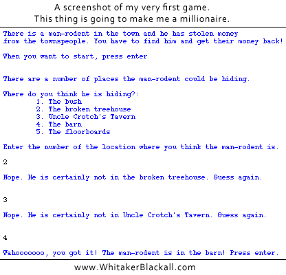 在我学会了一些非常基本的知识后,我随意的做了很多文本形式的小游戏,比如刽子手,jotto,猜数字。我的第一个比较大一点的小玩意叫做“大齿怪”。这个游戏的情景是关于一个大齿怪(把它想成一个怪物吧),祸害村里。它藏在什么地方,你需要去猜它在哪: