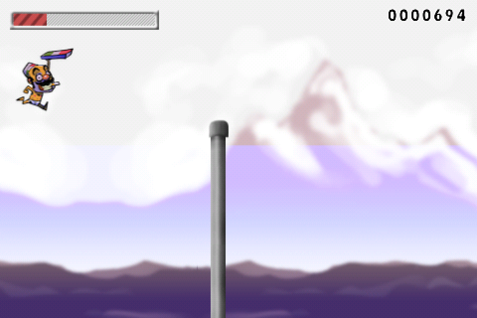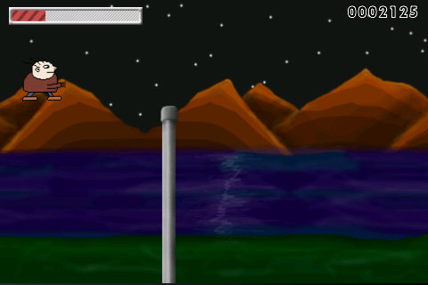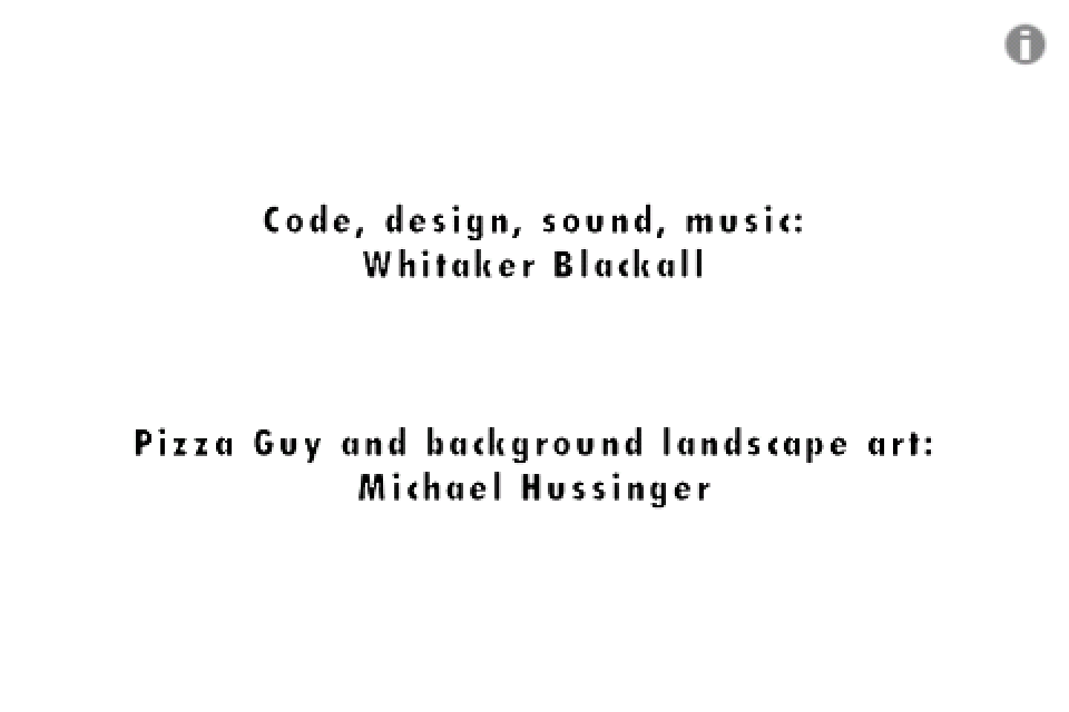 因为画的太差,我询问Michael Hussinger是否愿意为我做一些简单的修改,他同意了!他在二十分钟内画出来一个让人惊叹的匹萨伙计。我估计花几个小时也画不出这么好的作品来。他还为游戏中的视差效果画了一个漂亮的山作为背景。下面的是在他的帮助下游戏的样子,我加上了标题和鸣谢页: