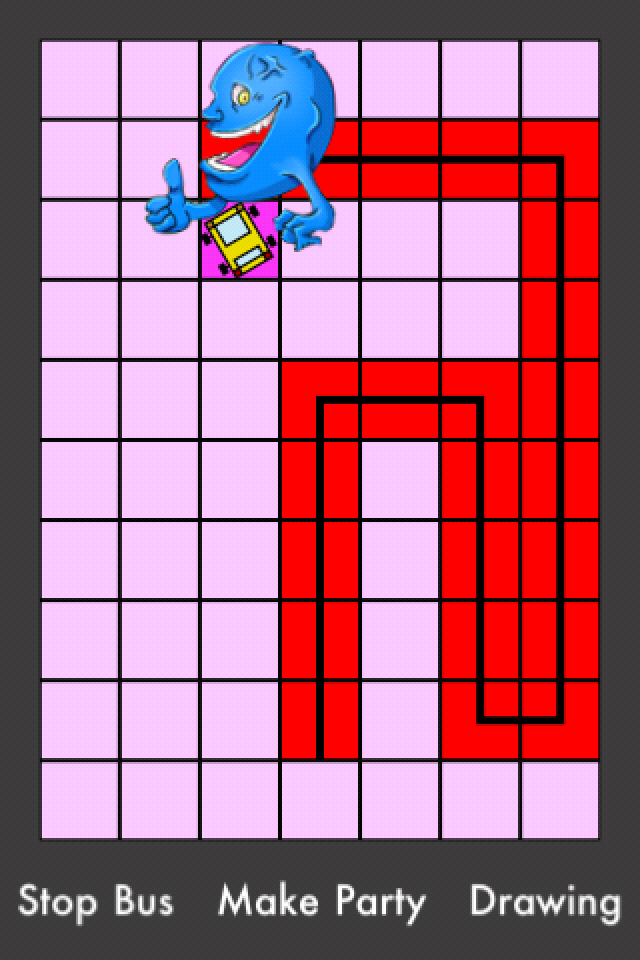 我的下一个游戏受Trainyard的启发。我想看看是否能做出 一个地图,上面画些网格道路,卡车能跑在上面。看看,制作“狂欢者”有了很好的回报。所以我称这个为“狂欢大巴”。游戏的玩法是点击地图上的一个地方 设定一个聚会点(一个闪烁的,颜色变换的点,伴有音乐),然后图上会画出一条路,通向这个点,“狂欢者”会把他的“狂欢大巴”开到那里。不用说,这是一个 非常简单的游戏。但里面很酷的东西是,当他到达目标地点后,音乐声会变大,卡车会开始跳舞,Craig画的作品会出现在开车上面左右摇摆!