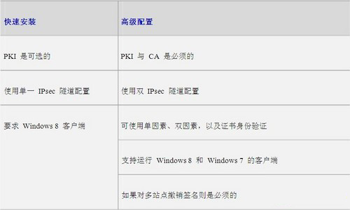 在Windows Server 2012中部署DirectAccess时,请注意有两种不同形式的部署场景:快速安装和高级配置。从较高角度来看,这两种场景的区别请参见下表: