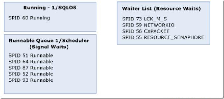 在了解了SQL Server基本的调度算法后,再让我们通过一个图来了解一下简单的SQL Server中线程的几种状态(这类线程对Windows来说是线程,对SQL Server来说是进程,这也是为什么查询这些线程的时候用的是Sysprocess),如图所示。