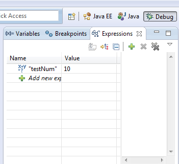 按Ctrl+Shift+D或者Ctrl+Shift+I来显示选定变量或者表达式的值。我们也可以给一个变量或表达式添加观察点,当程序在调试时,这些观察点会在表达式视图(Expression view)中显示出来。