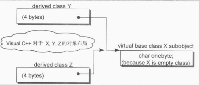 ● 编译器对于特殊情况所提供的优化处理,因为class X有1 byte的大小,这样出现在了class Y和class Z身上。这个主要视编译器而定,比如某些存在这个1byte但是有些编译器将他忽略了(因为已经用虚指针了所以这个1byte可以不用作为内存中的一个定位)。
