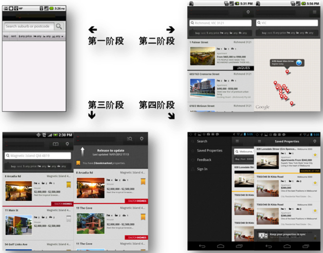 可以看出在项目所经历的四个比较大的阶段中,仅一个首界面的功能,也经历了从开始的普通列表界面,到后来增加地图功能、书签的过程。在第四个阶段中,为了满足用户注册登录等需求,首页面还进行了基于左侧滑动菜单的导航转型与登录反馈等的功能扩充。每个重大阶段的转型,都来自真实的市场评论数据,并结合 Omniture(通过收集用户数据行为分析的工具)等产品的体验数据分析与业务增长需要进行开发。