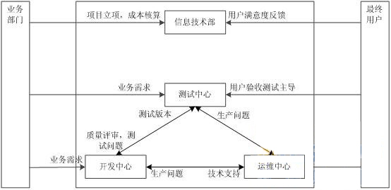 测试中心接受业务部门的测试需求和任务,与开发中心同步开始需求的分析,制定测试计划,设计测试架构,参与评审开发中心的系统需求和总体架构,编写测试用例。从开发中心接收到测试版本后,进行系统测试、性能测试(以及安全测试等非功能测试),和用户验收测试,测试过程中发现的问题即时反馈回开发中心修复。测试通过后,提交给运维中心上线,运行过程中,遇到功能缺陷,运维中心反馈回开发中心和测试中心确认,测试中心协助开发中心定位问题,开发中心修复缺陷后,再经由测试中心验证,提交给运维中心。运维中心在系统上线和运行过程中,遇到一些使用问题,如安装、系统配置,功能使用方式等,可要求开发中心提供技术支持。