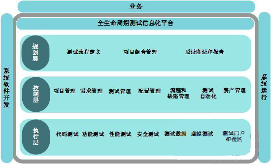 测试中心信息化平台参考框架规划层包括“测试流程定义”、“项目组合管理”和“质量度量和报告” 3个 IT 能力组件。