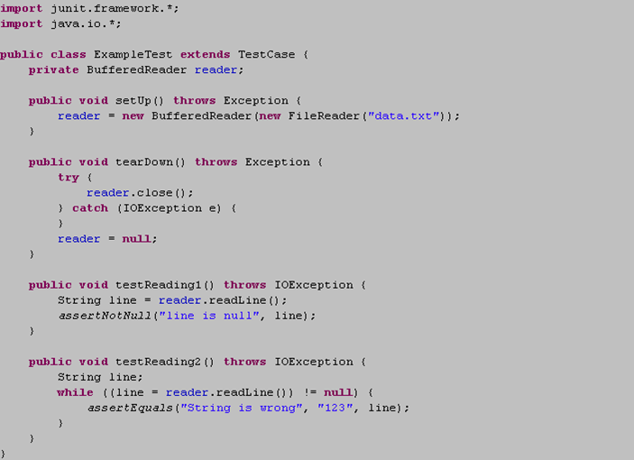 testReading1() 和testReading2()是实际的测试用例,它们的修饰符必须是public,返回值为void,方法名必须以test为前缀。