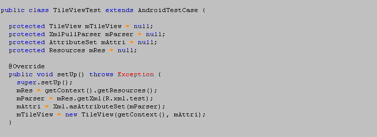 TileViewTest继承自AndroidTestCase。AndroidTestCase与一般的JUnit TestCase的主要不同之处在于它可以通过getContext()方法得到被测应用的context,但无法得到测试本身的context,也无法获得测试应用自己的resource。当有Res.getXml(R.xml.test)这种访问resource的需要时,必须修改或调用被测应用的resource。这一点需要注意。