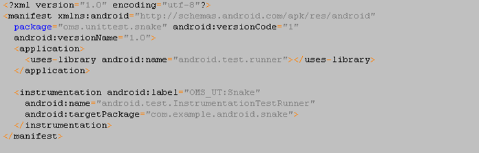 ● 展开SnakeUnitTest,双击AndroidMenifest.xml 。